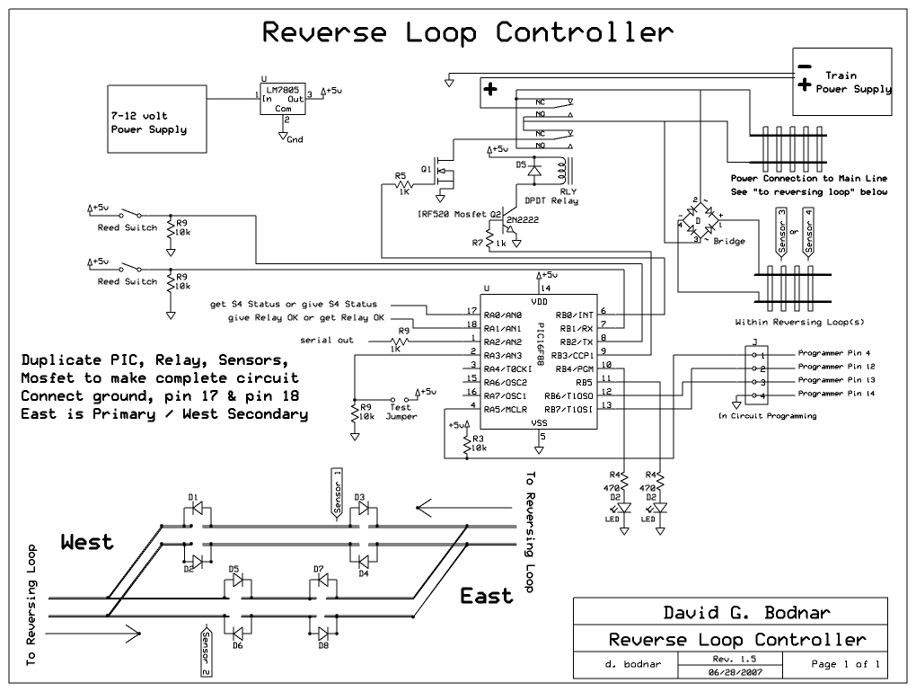 Overview: A reversing loop is frequently used by model railroaders to reverse an engine's path on a single main line. The problem with reversing loops is that they create a short circuit within the track as the loop connects the two rails of the main line. This problem is addressed in a number of ways. The simplest and most common is to completely isolate a section of the reversing loop from the main line. This isolated section must be long enough to accommodate the engine and any cars that might have pickup wheels that feed power to the engine. The isolated section is powered from the main line through a bridge rectifier. This device supplies the same polarity of power regardless of the polarity that is fed into it. When the train has fully entered the reversing loop a reed switch is tripped by a magnet under the engine triggering the controller which throws the DPDT relay reversing the power to the main line so that the train moves in the proper direction upon exiting the reversing loop.