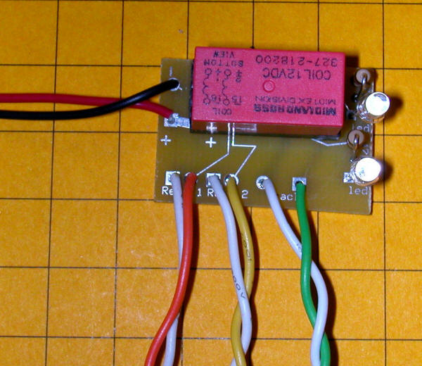 The reed switches connect to the red/white and yellow/white wires. The green/white pair of wires goes to the track. The two LEDs to the right are optional and just show which way the relay is latched.