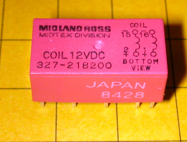 The dual coil latching relay shown below is rated at 2 amps and fits into a standard 16 pin IC socket. You can see a representation of the two coils on the label. One goes between pins 1 and 16 and the other between pins 2 and 15. Note that these coils are polarity sensitive, that is it matters which end of the coil connects to positive and which connects to negative. The + and - symbols by the pin numbers indicate which pin connects to positive and which goes to negative.