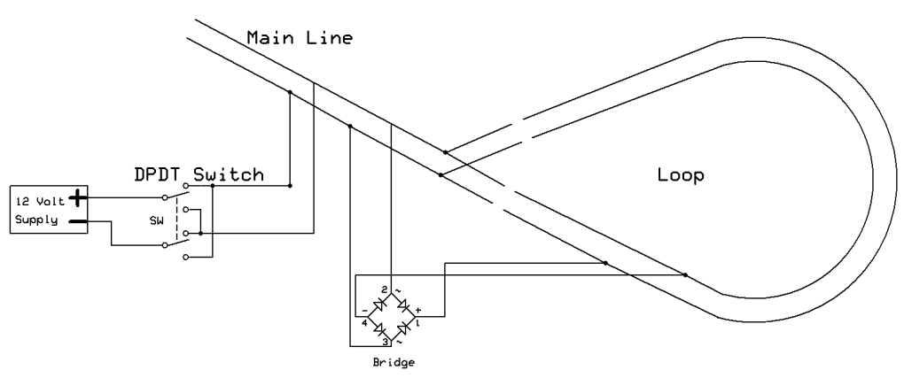 The advantage of using the bridge rectifier is that you can pick up power from the main line right before the switch and feed it to the bridge. This has the potential to shorten the amount of wire that must be used, especially if there is a great distance between the power supply and the loop. The only disadvantage in using the bridge rectifier is that the train will slow a bit in the loop as the bridge drops the voltage by a little more than one volt.