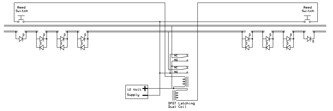 To automate the train's operation in the loop the DPDT switch is replaced by a dual coil DPDT relay. The coils of the relay are connected to reed switches that are placed under the track somewhere within the isolated track in the loop. When the magnet under the train passes over the reed switch the polarity in the main line is reversed so that the train can exit the loop and continue on its way onto the main line. Because the loop is being fed by the bridge rectifier the polarity within the loop never changes.