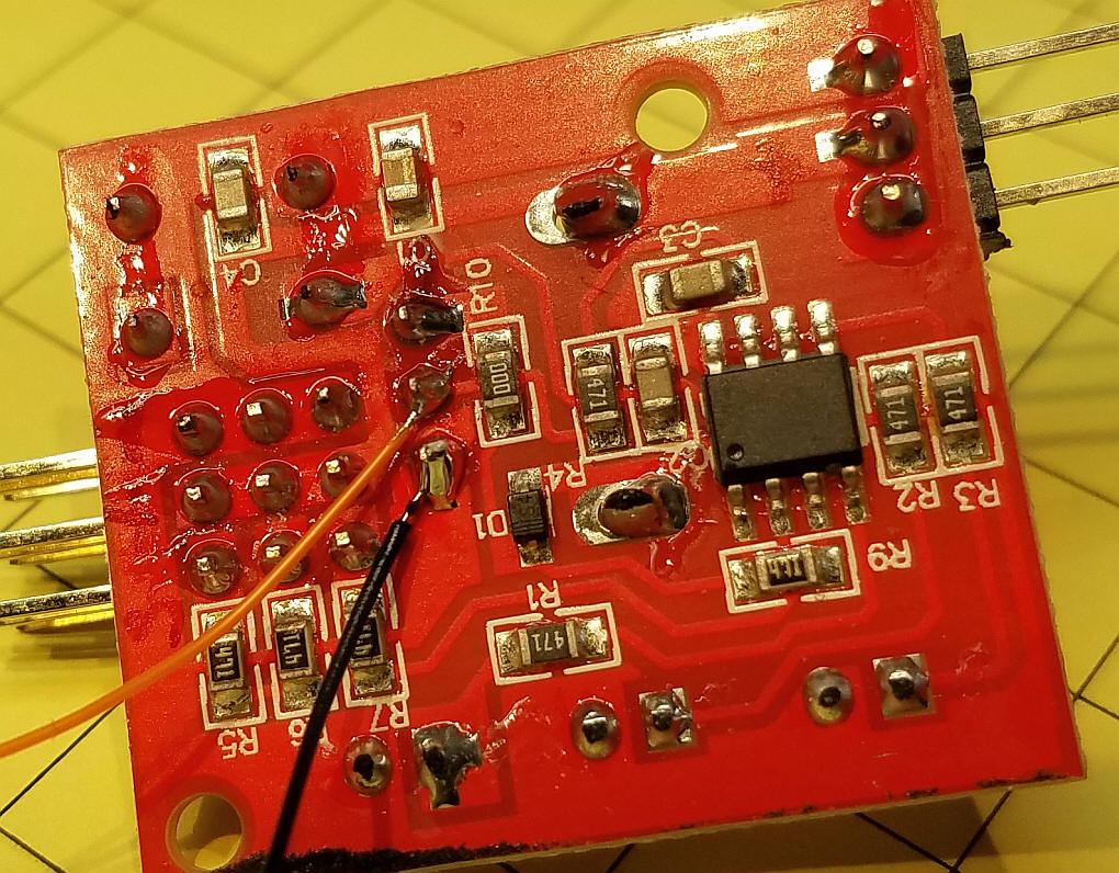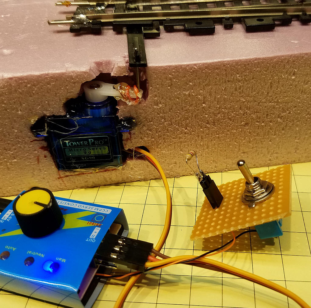 Wiring the Modification The wiring is quite simple. Two wires are soldered to the potentiometer's wiper (center lead) and the potentiometer pin that connects to ground. The black wire below goes to the ground side of the pot and the orange to the center lead. If you prefer you can solder to the leads on top of the board. First tin each pin with a drop of solder then solder on the wires. My test setup is shown here. The servo is mounted in a piece of foam and connected to the switch throw arm with a small piece of piano wire. The switch and resistor are mounted on a small piece of circuit board. The resistor plugs into a socket so that I can easily swap out resistors for testing.