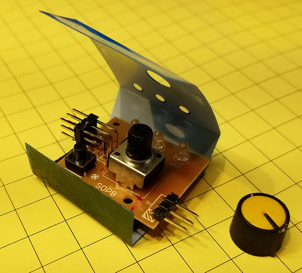 Controller Operation The controller has three connection pins on one end, three sets of three connection pins on the other side, a potentiometer on top and a hidden push button switch under the cover. There are three LEDs that show the mode of operation that has been chosen. To operate the controller connect a DC voltage between 3.5 and 6 volts to the two pins in the single set of three. The positive connection goes to the pin in the center and the negative connection to the pin closest to the edge of the circuit board. In this photo the controller is connected to a 3.7 volt cell phone battery. There is a label on the case of the controller that indicates which pin is positive and which is negative but, for some reason, it was not over the pins on the units that I tested. Connect the servo's three pin cable to one of the three sets of pins on the other side of the controller. The negative wire from the servo (usually colored brown or black) goes to the pin marked with a minus (-) sign.