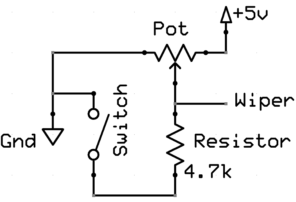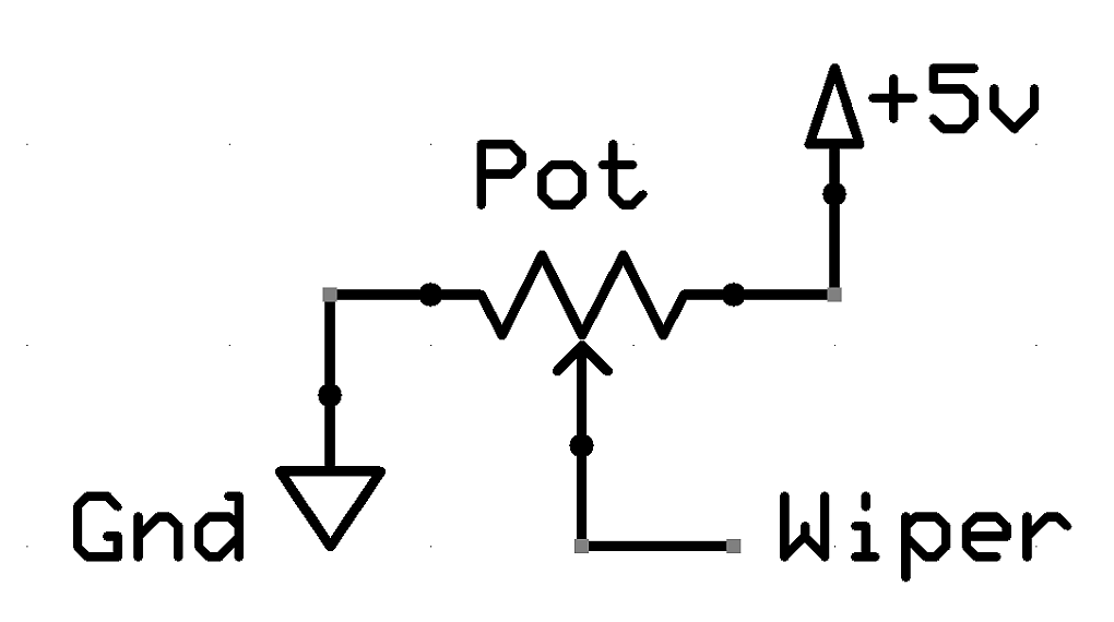 Modifying for Limited Movement The servo control board can be used to operate a servo that moves the points on a switch. Unfortunately the controller can easily move the servo much more than is needed to throw the switch, causing damage to it. While you could use a physical stop that would limit the potentiometer's movement to what is needed to operate the switch servo I thought it would be better to look for a way to modify the circuit so that it would be unable to move the points farther than needed. I spent some time examining the board and noted that the potentiometer is wired as a simple voltage divider that delivers a voltage between 0 volts and 5 volts to a pin on the microcontroller. In the photo below the three pins attached to the potentiometer are shown. The pin to the left is connected to ground (negative power connection), the pin to the right is connected to 5 volts (or whatever the power supply provides) and the center pin connects to a wiper inside of the potentiometer that moves as the knob is turned. When the knob is all the way to the left (counter clockwise) the pin on the microcontroller that is connected to the wiper sees 0 volts. When it is turned all the way to the right it sees 5 volts. Positions in-between the extremes deliver a voltage between 0 and 5 volts. This variable voltage determines the position of the servo. This diagram shows how the pot (potentiometer) is wired to the circuit. The arrow that represents the wiper moves from side to side delivering a voltage that is proportional to its position between 0 volts (ground) and 5 volts.