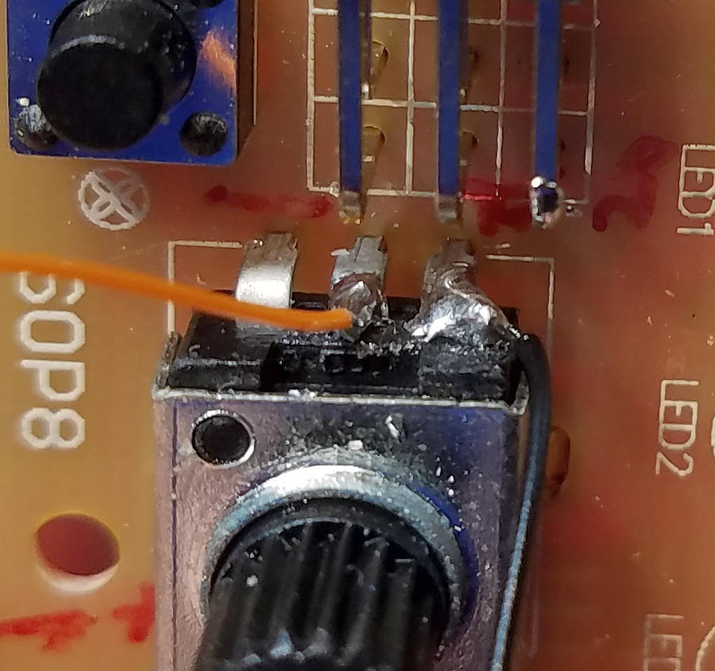 If you look carefully you will see that the two pins that get power are marked 5V and - (see area circled in yellow) The underside of the board contains a microcontroller (the 8 pin device left of center) and a number of surface mount capacitors and resistors. The three pins circled connect to the potentiometer.