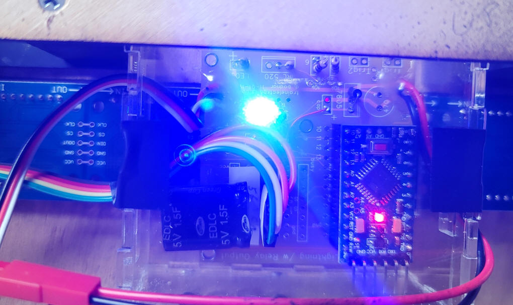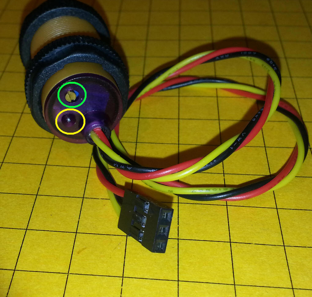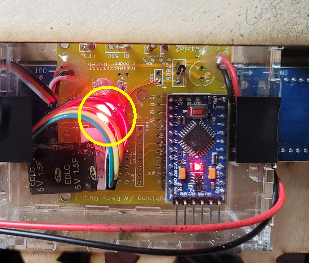 The sensor is also available from Amazon. The unit has 3 wires that need to be connected, +5 volts (red), ground (black) and sensor output (yellow). The small screw (circled in green) can be used to adjust the range of the sensor. The red LED (yellow circle) lights when an object is detected. An Arduino Pro Mini provides the control of the unit and is connected to the sensor and display. There are two LEDs, one red and one blue, that give status information - this is explained below. |