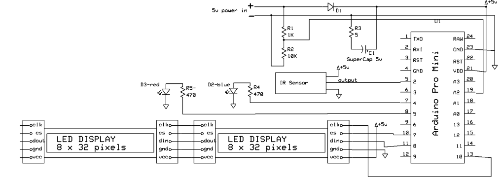 Hardware The display is made up of 2 four digit LED matrix displays. They are available from Amazon and other sources. They use a MAX7219 controller and can be addressed by using an Arduino library.