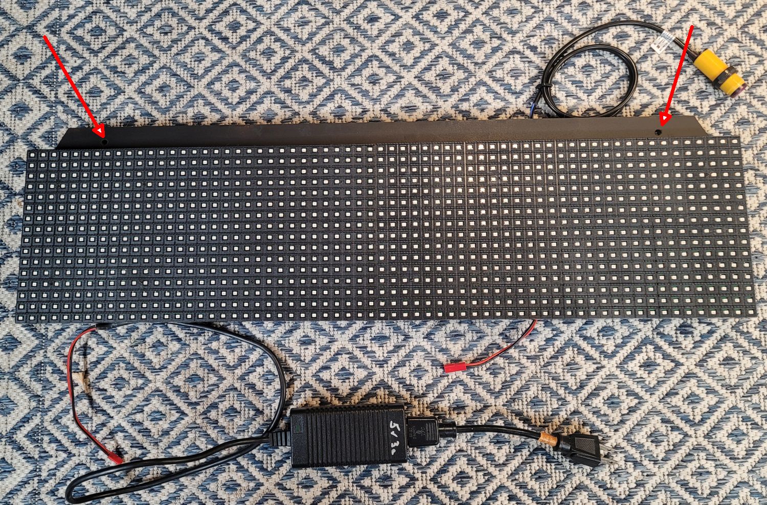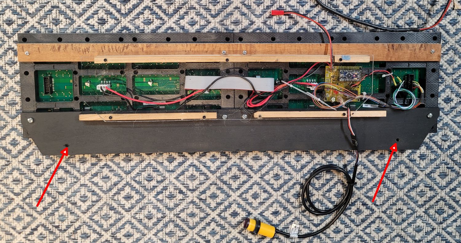 Two large panels are joined together in this lap counter. Mounting holes are indicated by the red arrows.