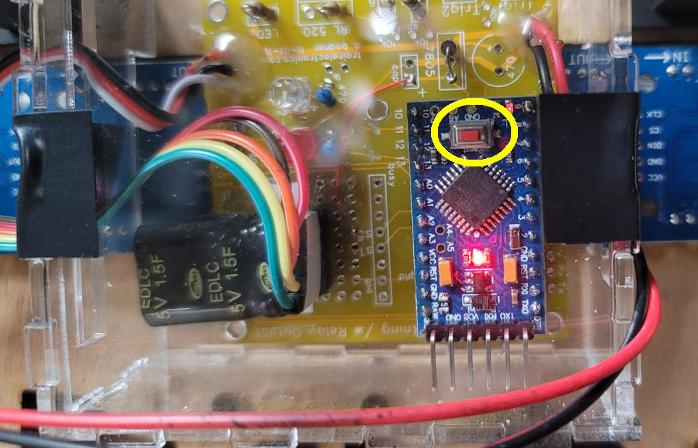 Troubleshooting If the counter stops incrementing is the display is off the unit can be reset by pressing the small button on top of the Arduino (circled in yellow in this photo). The top of the clear enclosure can be removed by removing the two pieces of black tape that hold it on.