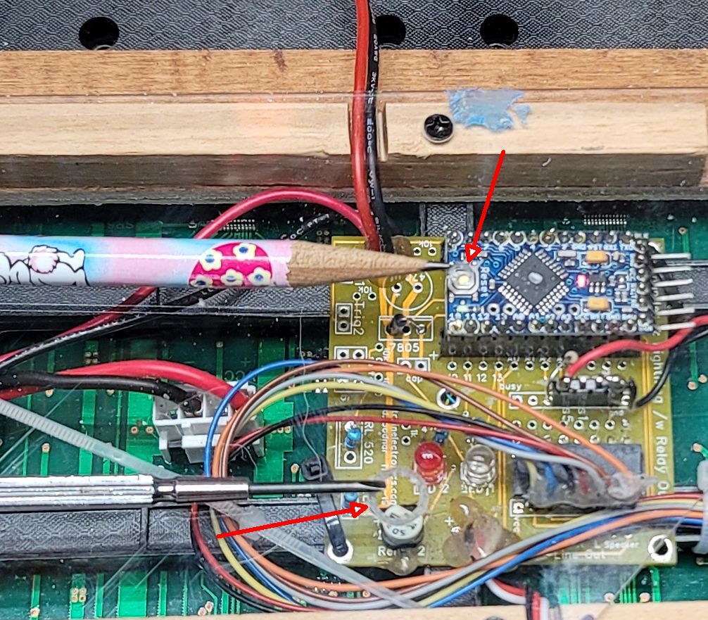 Two holes in the acrylic cover allow access to the reset button which is at the end of the pencil - a toothpick or pencil can be inserted in the hole in the acrylic to do a reset should that ever be needed The lower hole, at the end of the small screwdriver, can be used to adjust the brightness. It is normally set to a medium or low brightness. Note that using high or maximum brightness will cause the unit and power supply to run hot.