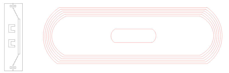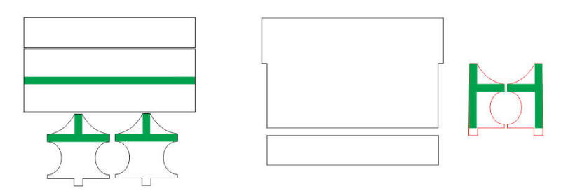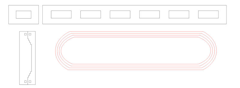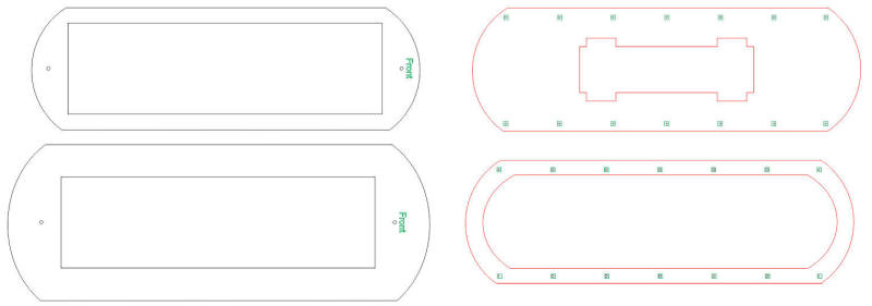 The Base The base was cut from 1/4" plywood and 1/8" acrylic. The top section (upper right image) has a cutout for the motor block as well as square holes for the grab poles and front/back curved skirts. Three of the part in the upper left were cut from 1/4" plywood and one of the larger section (lower left) was cut from 1/8" acrylic. The lower right part goes above the grab poles. |