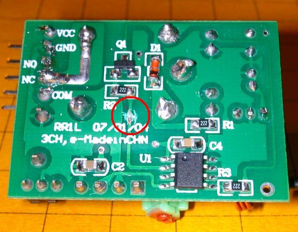 Notice the "X" in the bottom left area of the receiver board. That indicated a place on the circuit board were a trace needs to be cut. It can be seem more clearly in the photos below. This cut allows the PIC 12F683 to control both the DPDT and the SPDT relays.
