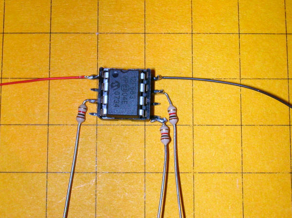 This PIC processor is in an 8 pin socket that has its pins bent to the side. A red wire goes to pin 1 and will supply +5 volts. A black wire goes to pin 8 for ground. Three 1/8th watt, 1000 ohm resistors go to pins 3, 5 and 7. After this wiring is done the socket will be glued to the on-board relay.