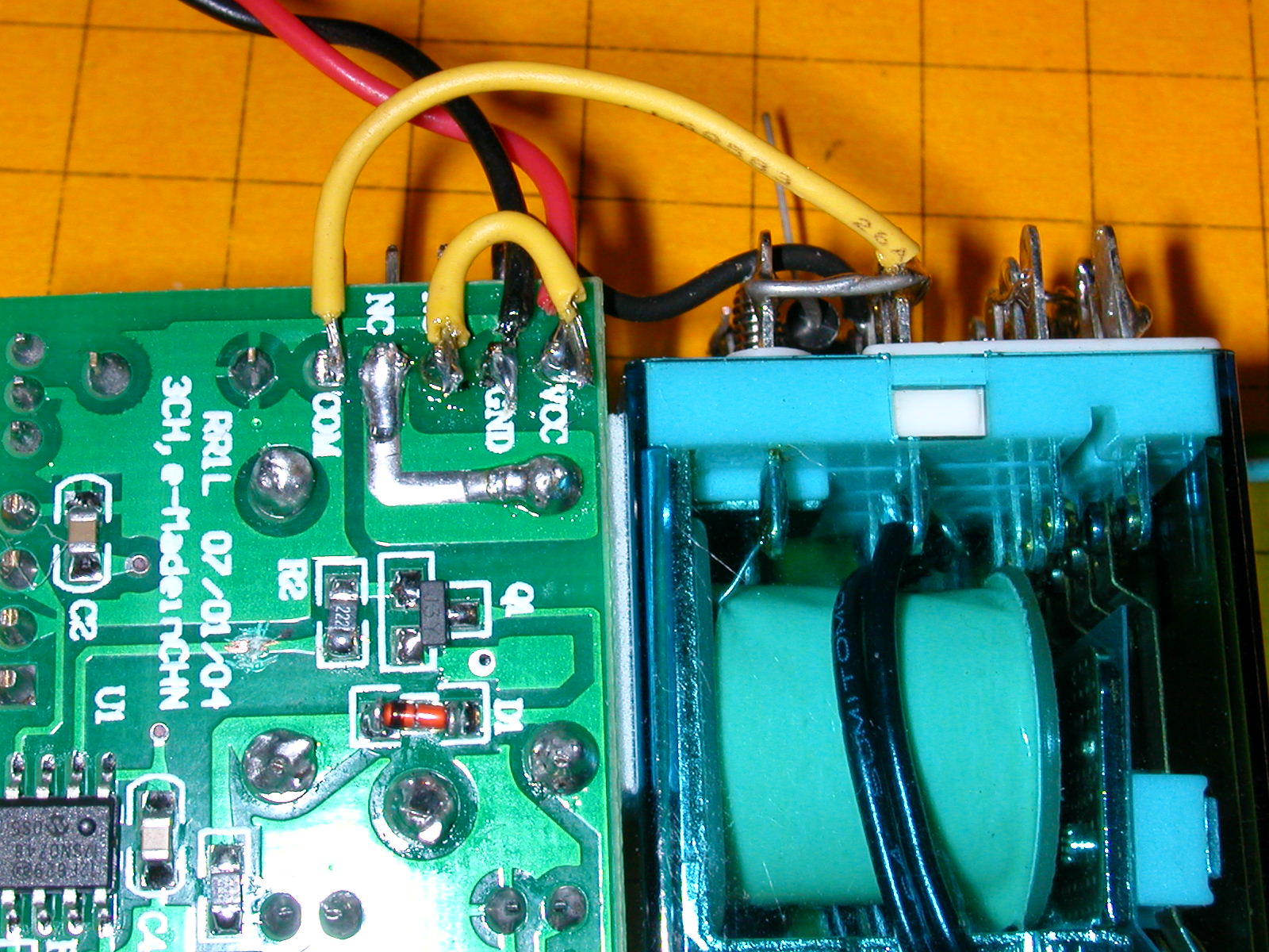 The positive wiring goes from the VCC terminal on the main board to the NO terminal (small yellow jumper) then from the COM terminal to the positive lead on the new relay.