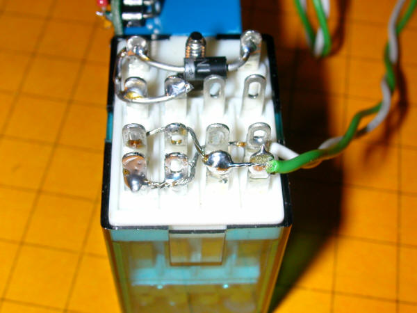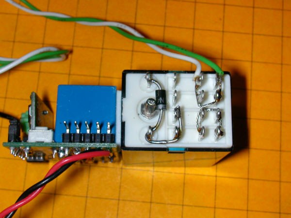 The first wires connect the board to 12 volts DC through the red and black wires. The diode is across the relay's coil contacts. The anode end of the diode (with a silver band) goes to what will be the positive connection of the coil. Note that the lead also connects to the two terminals above it. The green and white wires will go to the turnout motor. They cross with the green wire going high and the white going low.