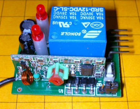 You will note that the power to the DPDT relay's coil goes through the NO contacts on the board's relay. This assures that power only goes to the DPDT when the button on the transmitter is being pressed. The polarity of the power going through the relay is controlled by the PIC processor through its pin 5.