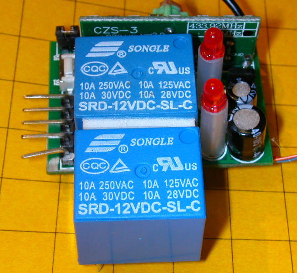 When I first started experimenting with these remote control receivers I was planning on using them to control the switch motors on my turnouts. I reasoned that a battery operated remote control unit would be an ideal way to avoid installing hundreds of feet of wire to my widespread turnout motors. Unfortunately I soon discovered that the stock receivers, shown above, came with a SPDT (Single Pole Double Throw) relay. Most turnouts, including those from Aristo Craft and LGB, require a DPDT (Single Pole Double Throw) relay to change their position. (Please see a my article "Turnout Motor Control" for a more detailed discussion of turnout motors and how they operate.)
