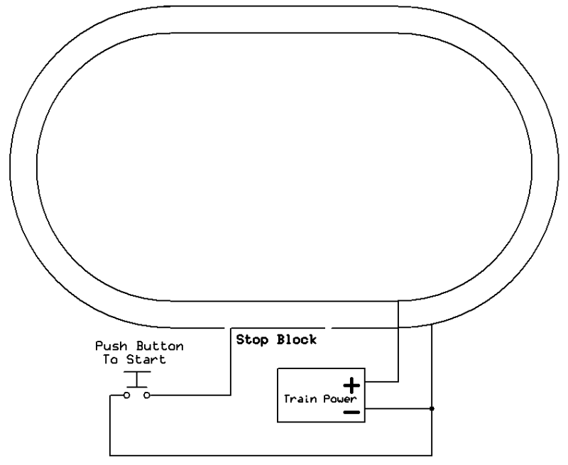 For simplicity's sake let's work with a basic oval of track with a short insulated section where we want the train to stop and wait. We'll call this the stop block. Note that in the stop block only one rail of the track is not connected to the main loop. It is not necessary to isolate both rails.