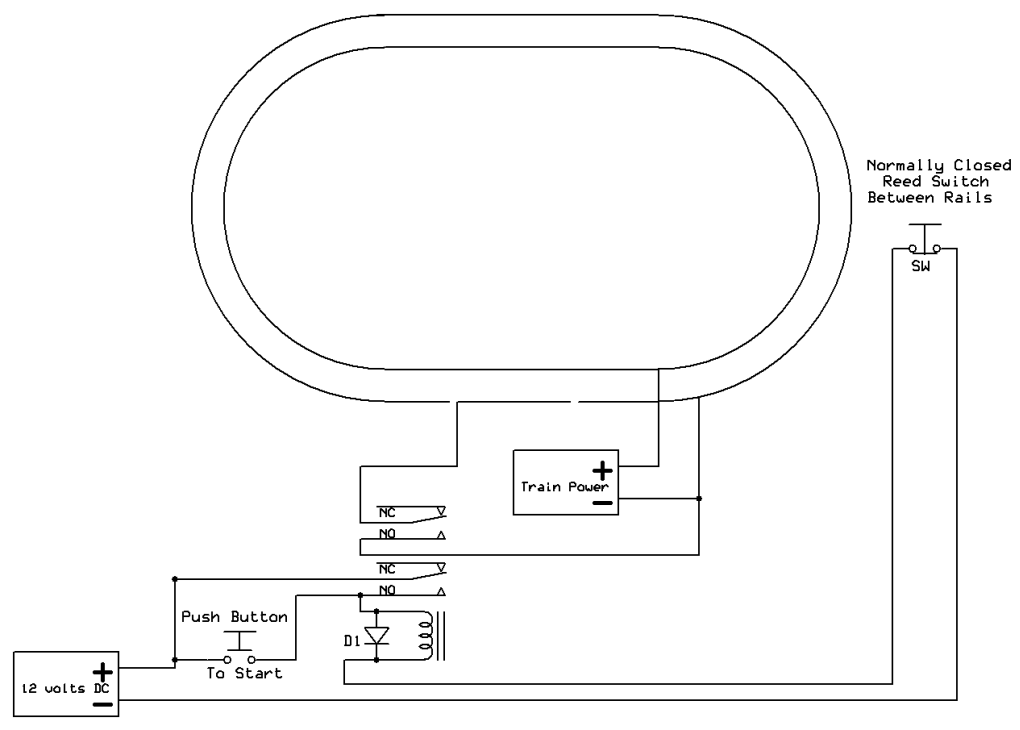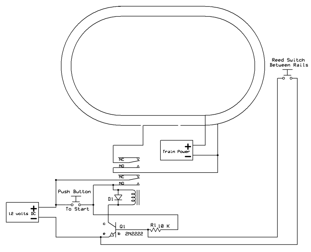 In the diagram above transistor Q1 is inserted in the circuit. Once the start button latches the relay Q1 is also turned on as 12 volts is applied to its base through resistor R1. This keeps the relay active. When the reed switch is closed by the passing train it connects the base of Q1 to ground turning the transistor off and removing power from the relay causing it to open. The diode, D1, protects the transistor from the voltage spike that the relay's coil creates when it is turned off.