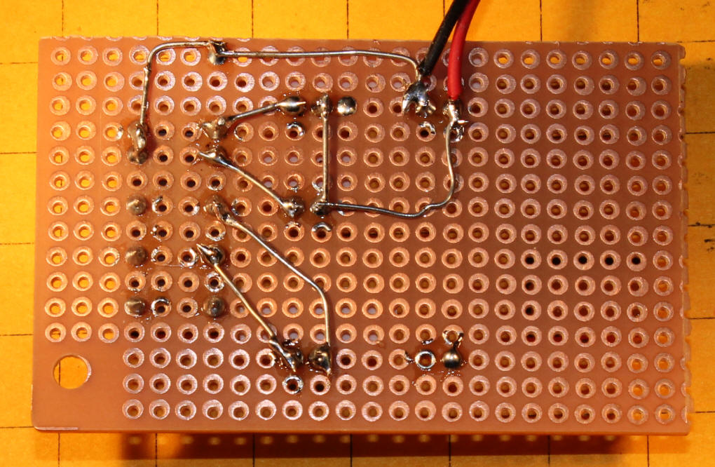 My first test circuit is shown here. It uses what is commonly described as "dead bug" construction. That name comes from the similarity between dead insect legs and the component leads to go every which-way when you wire like this! The transistor is the black object in the upper right. The diode is marked "9127". The red/black wires from the left supply power, the grey ones go to the start switch, the double red wires go to the reed switch and the remaining red/black go to the stop block.