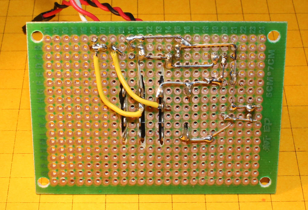 Here is the back of the board. Note that the relay shown here is a 4PDT (Four Pole Double Throw) relay. That means that it has four sets of contacts. We are only using two of the sets so the remaining ones can be used for other purposes.