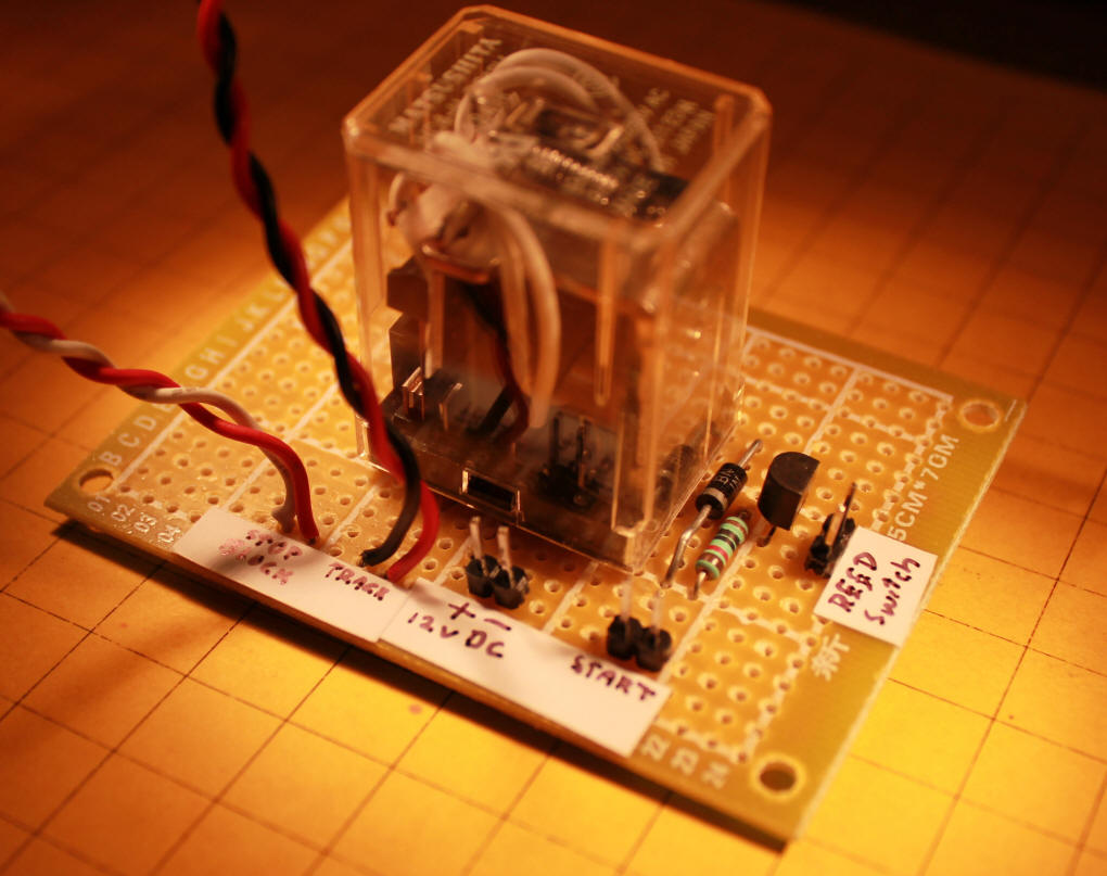 This more refined circuit shows a larger 12 volt relay, the transistor and other components as well as the connections that go to switches and the track.