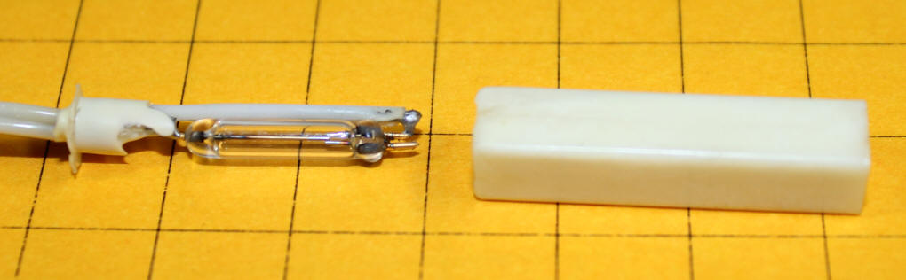 The switch is in a plastic enclosure that is at the end of a 3 foot long cable. It was easy to pick at the glue that sealed the end of the tube to free the switch. The reed switch itself is less than 2 cm in length (the squares below are 1 cm on a side).