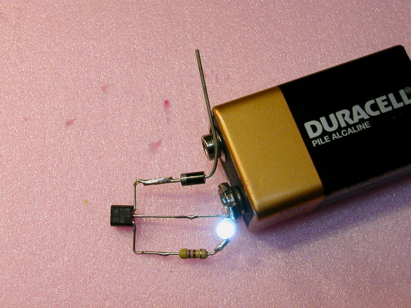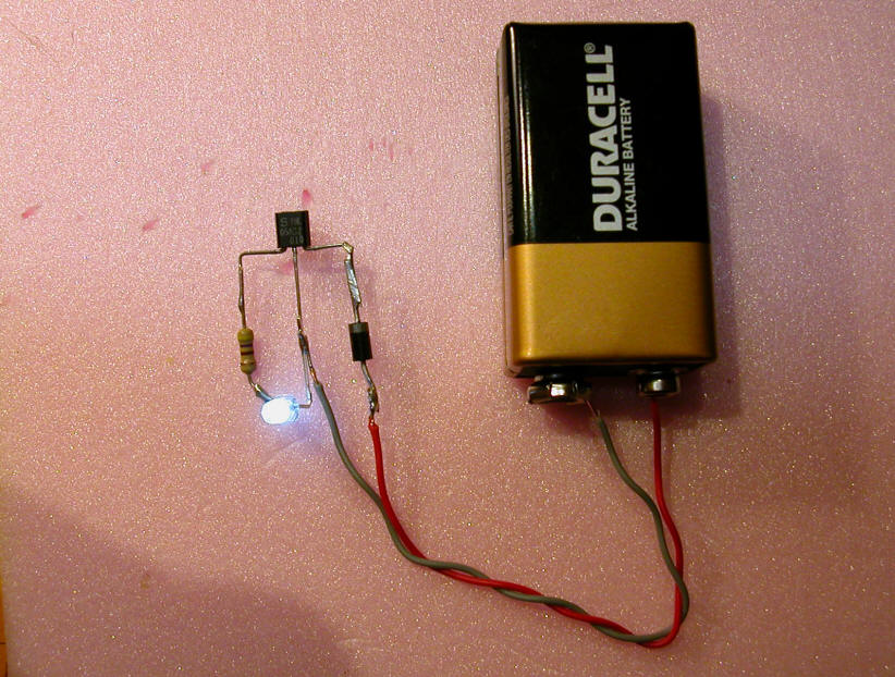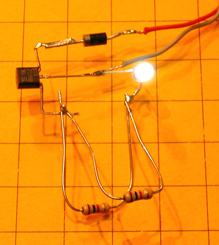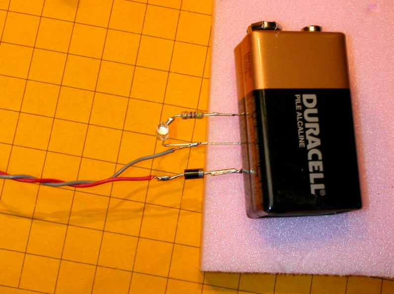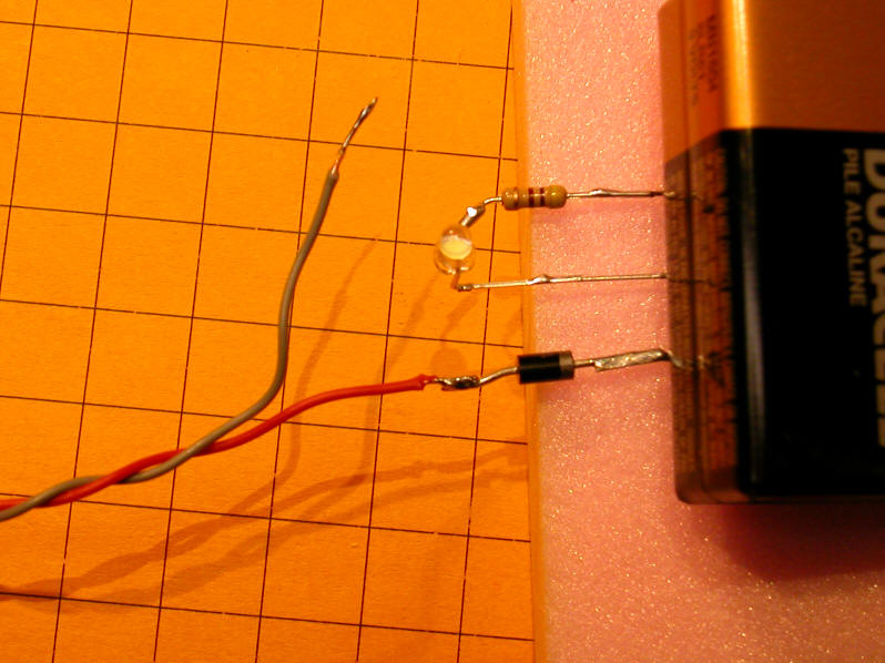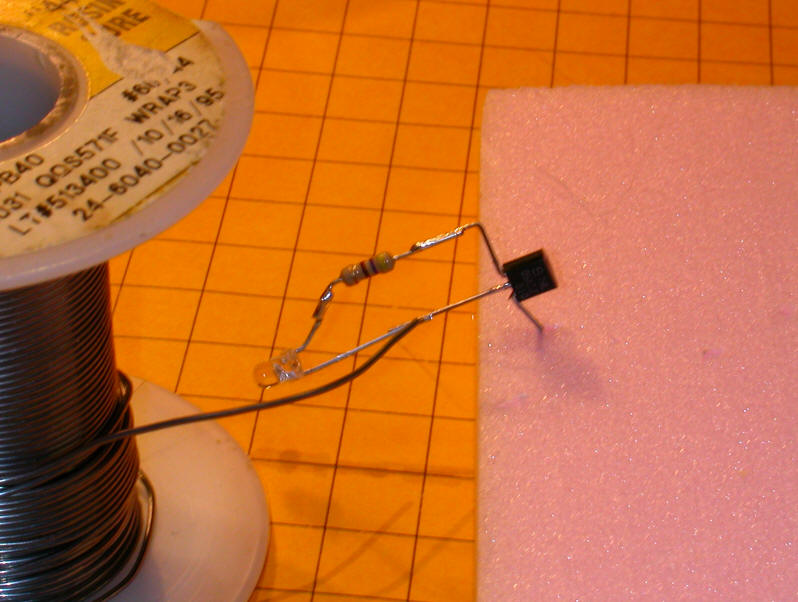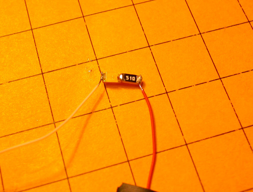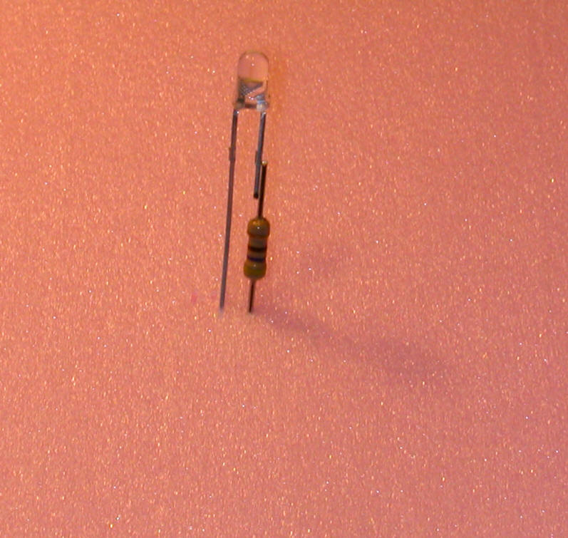 Note that the resistor being used below is marked "510" - this is a 51 ohm resistor. (Take the first two digits, 51 in this case, and multiply them times 10 to the power of the third digit, 10 to the zero power in this case, which is 1 - a resistor marked 513 would be 51,000 ohms as 10 to the third power is 1000. 51 x 1000 = 51,000)