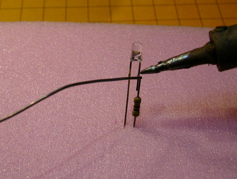 | Soldering Push the leads of the resistor and LED into a piece of foam to that they are held in proper orientation during soldering. Note that the resistor and LED lead are not quite touching. This was done so that the individual parts would show up in the photo. Before soldering make sure that they touch evenly.