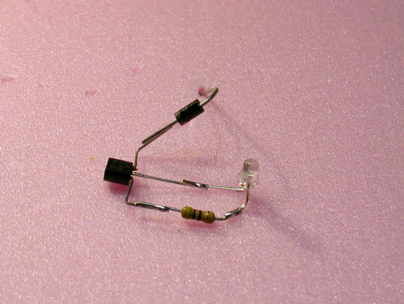 circuit a try by following these step-by-step directions. LEDs are ideal for use in model train lighting as they can be wired so that they attain their full brightness at a low voltage, a must if working from track power. In addition they also draw very little current, important for those of us who use battery power, and can be extremely bright. There are some precautions that must be taken, however, as LEDs can easily be destroyed if they are fed an improper electron diet! In order to protect the LED from excessive voltage and current a voltage regulator is used to keep the voltage to the LED constant. Once the voltage is constant a current limiting resistor can be selected that will deliver an appropriate amount of current to the LED. Detailed notes on selecting appropriate current limiting resistors are at the end of this article.