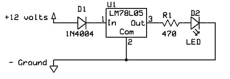 | Schematic The schematic is below. The positive voltage (marked +12) can be anything from around 7 to 20 or more volts. The circuit draws very little current and the regulator is rated for a maximum input voltage not to exceed 30 volts. If you use more than 12 volts it is a good idea to touch the regulator and make sure it is not heating up as excess power must be dissipated as heat. Note that the symbol for the diode, D1, has a vertical bar on the right side in this schematic. Diodes must be installed with the proper orientation or they will not work properly. There is a painted bar on one end of a diode, called the cathode, that corresponds to the bar on the right side of D1 in the diagram. The other end of the diode is referred to as the anode.
