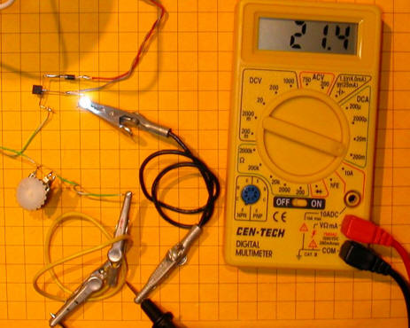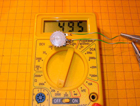 Note that the meter is set to the 200 ma range and that the display shows a bit over 20 ma. The LED being tested is rated for a maximum of 30 ma forward current but is quite bright at 21.4 ma.