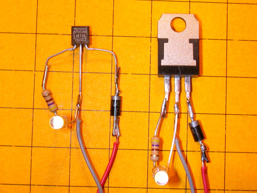 Components Here are the components needed. From left to right they are 78L05, 1N4004 diode, LED and 470 ohm resistor. The three leads on the regulator are, from left to right with the flat face showing as below, output, ground and input.