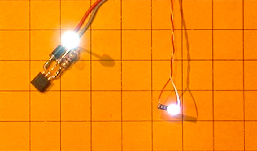 Here you see a 3mm white LED on the left and the surface mount unit on the right. The brightness is similar but the 3mm unit is much more focused. The surface mount is more of a flood lamp.