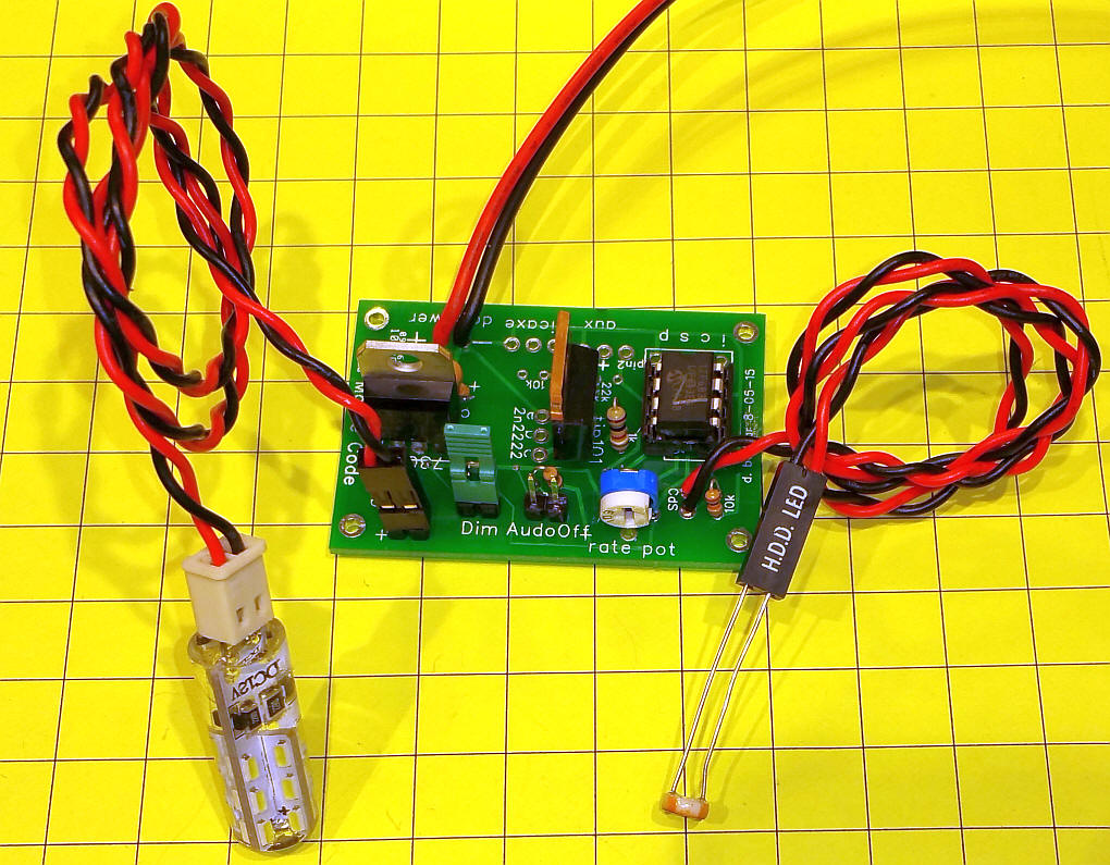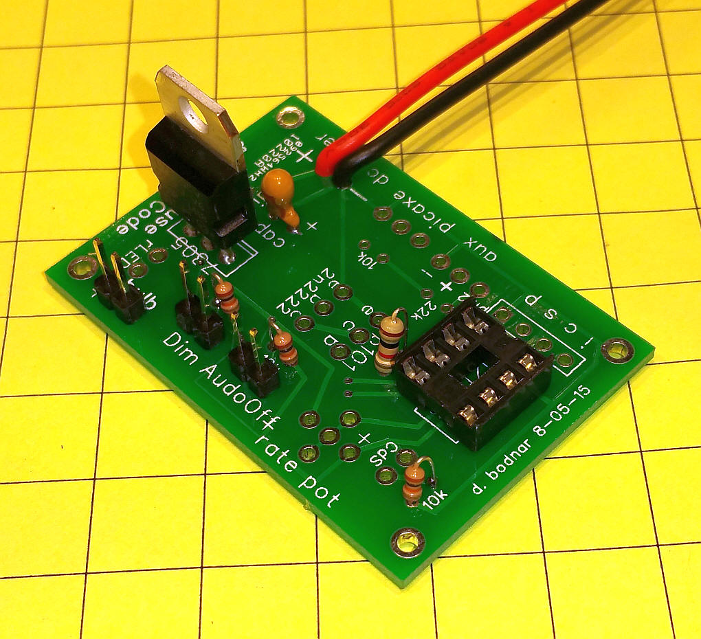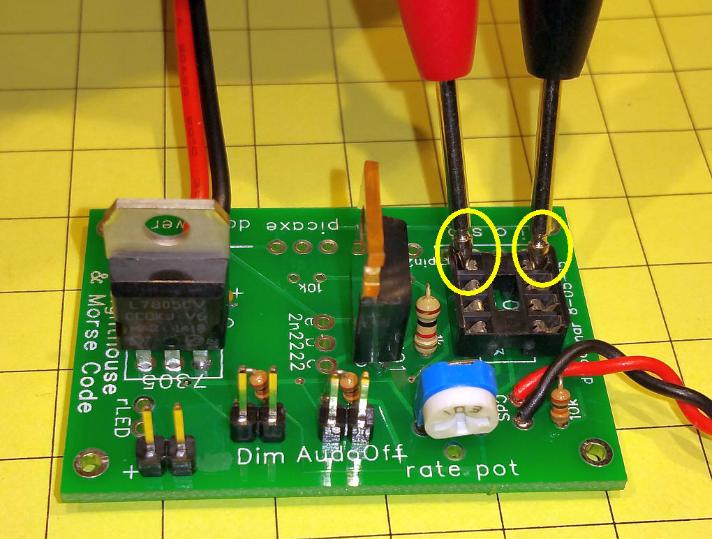 Connect the power leads to a 12 volt DC power source and check the voltage at pins 1 and 8 on the IC socket (circled in yellow). It should measure 5 volts plus or minus 0.1 volt.