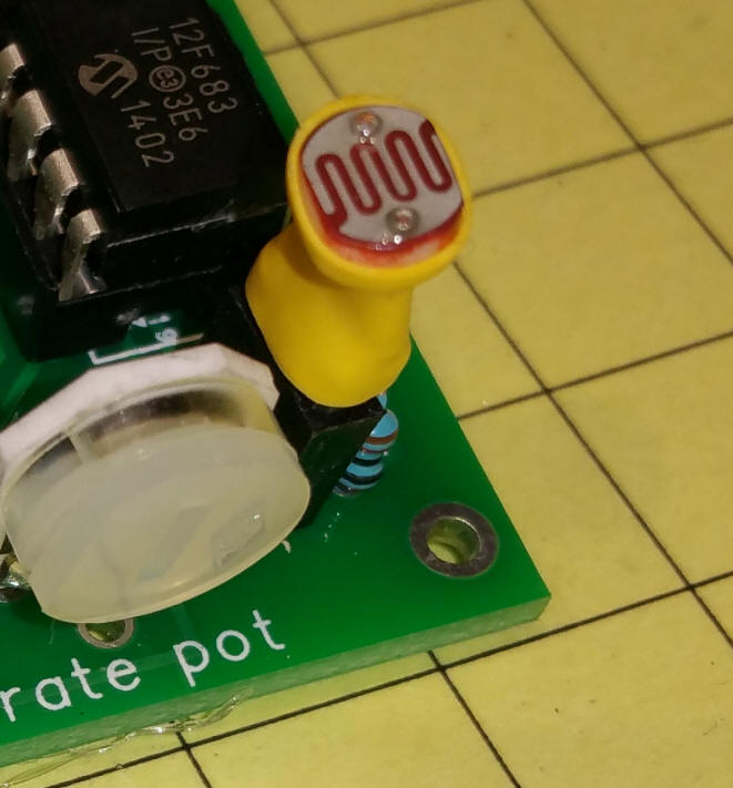 The light sensor plugs into one end of a twisted red/black wire that is soldered to the CdS labeled holes. Make sure the leads do not touch. You may want to trim the leads to a 0.5 inch length to keep them apart.