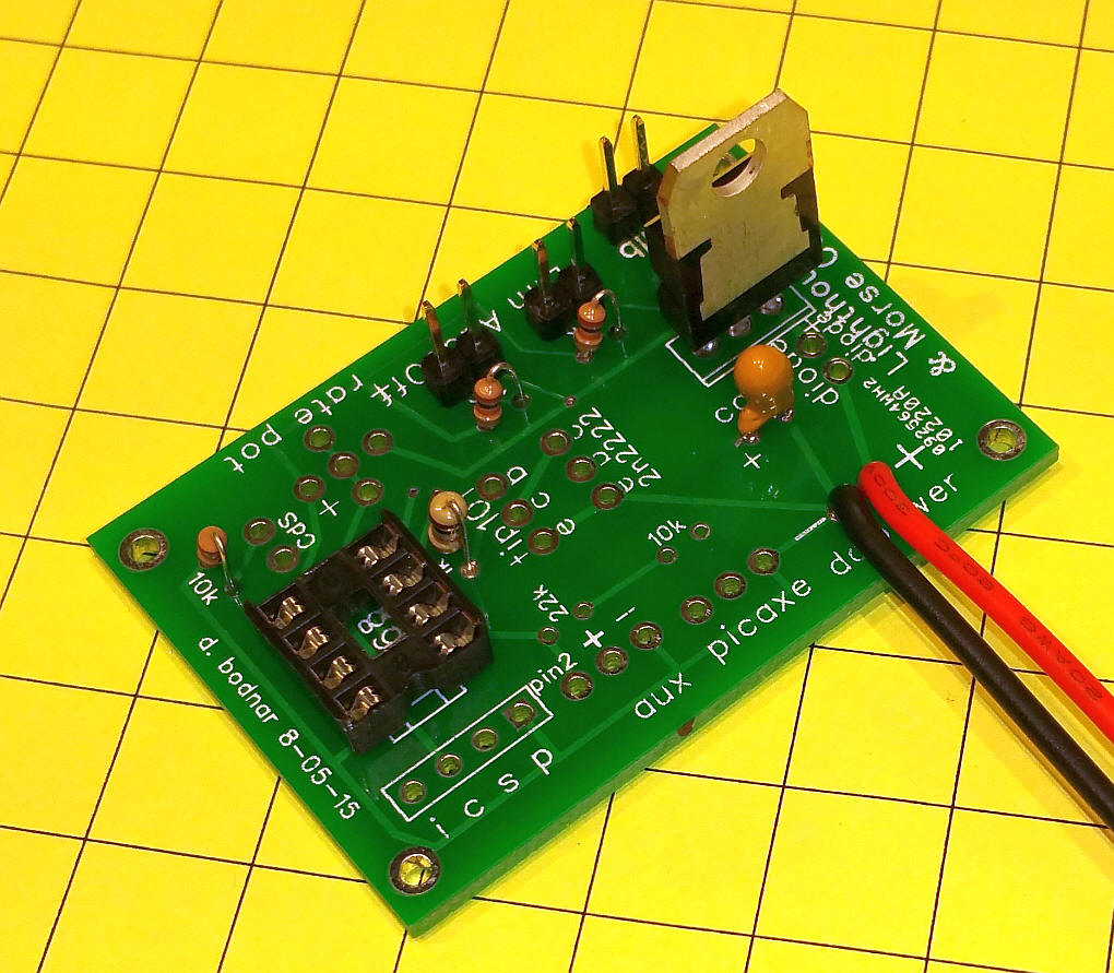 Add the remaining components. The power transistor (IRL 520) must be in the set of holes closest to the IC socket and must be oriented as shown.