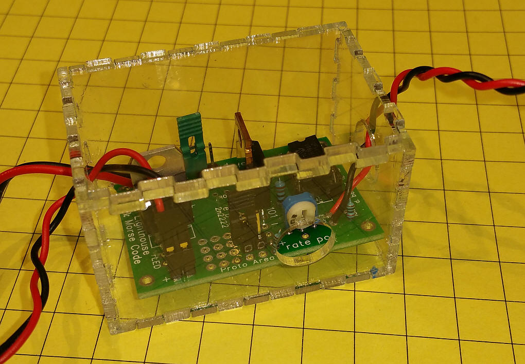 The lighthouse circuit and software have been updated to utilize very bright, very low power LED lamp modules. These devices contain 24 individual LEDs arranged in an array that sends light out in every direction. They are very bright while only drawing a small fraction of the power that halogen bulbs consume. In order to make these modules work in a realistic way the software has been rewritten and a faster microcontroller has been used. Features include: