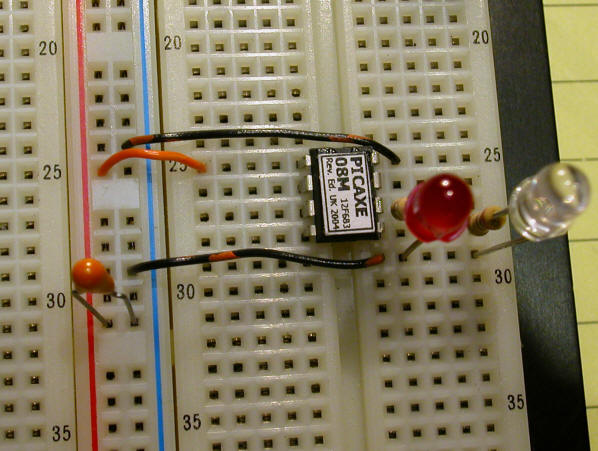 In the photos below the black jumper connects pin 8 of the Picaxe to ground, the orange wire connects pin 1 to + 5 volts. The red LED has the resistor soldered to one of its pins and goes between pin 6 on the Picaxe and the black jumper that goes to ground. The infrared LED also has its resistor attached and goes between pin 5 on the Picaxe and ground.