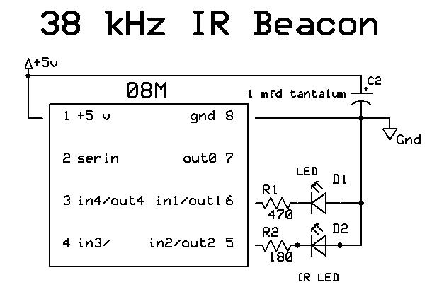 In the schematic below a Picaxe 08M microprocessor has been programmed to create a stream of 38 kHz pulses at pin 5. The only parts that are necessary to make this work are the 08M, a current limiting resistor and the IR LED. The 2nd LED and resistor, connected to pin 6, are just there to visually show that the system is working by flashing on and off. Even the filter capacitor is not necessary if you are running off of a clean battery power supply. Note that the resistor connected to the IR LED is considerably smaller (180 ohms vs. 470 ohms) than the one on the visible red LED. Even though the 180 ohm resistor allows quite a bit more current to flow to the IR LED it should not be a problem as the LED is on for a very short time as it pulses.