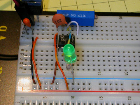 Here is the test circuit on the breadboard. An LED with a current limiting resistor soldered to its positive lead is connected between the output pin and ground. Note that the bypass capacitor is not installed for testing.