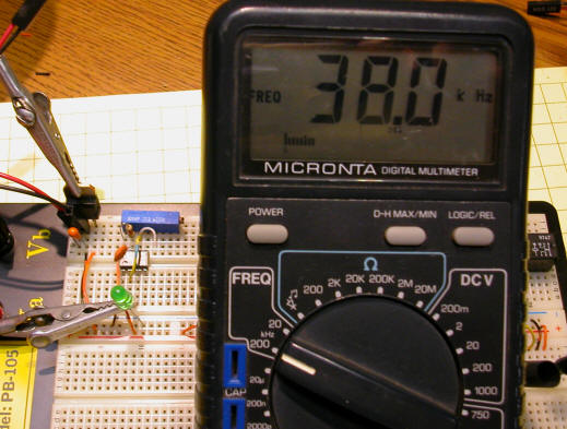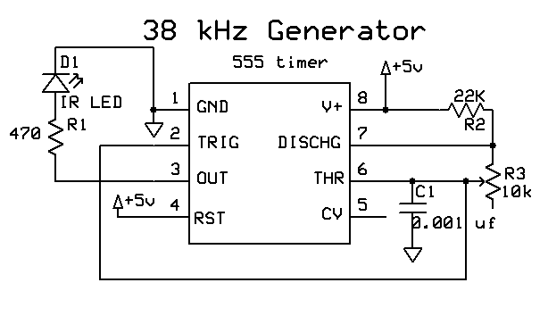 There are two disadvantages to this method of frequency generation. First, the frequency can change with temperature variations and as the components age. Secondly, one needs to have a frequency counter to do the initial setup. That is, you must connect the output of the 555 timer to an external frequency counter and adjust the variable resistor until the frequency reaches exactly 38 kHz.