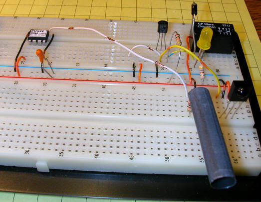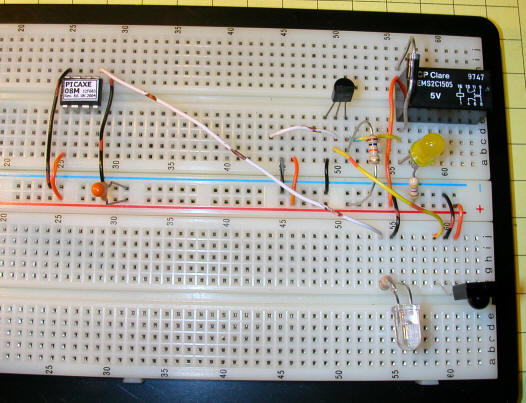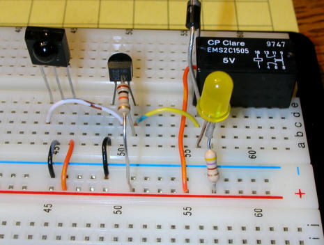This photo shows the circuit on the prototyping breadboard. The relay opens and the LED goes out when 38 kHz IR pulses are detected.