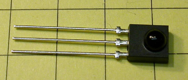 If you think that generating 38 kHz pulses is pretty easy you are going to be even happier with the hardware needed to detect them! Since so many home entertainment products use infrared remote control, detection devices have evolved over the years until they are just a single, 3 wire device, pictured below.