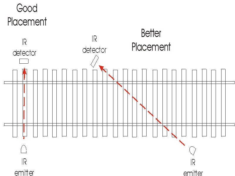 I have used this setup for nearly a year with a roadside crossing detector that I built for my railway. The IR LED is housed inside of an empty 357 shell casing. After you punch out the expended primer it is a simple matter to enlarge the hole to fit the LED. I found that a 13/64" hole works well. Similarly the IR detector is glued to the end of a shell casing that has had its primer hold drilled out to 3/16" to better fit the detector's lens.