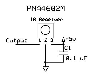 This device I am using is part # PNA4602M from Panasonic. It is designed to react to 38 kHz IR pulses. Note that there are different versions of this device that are tuned to different frequencies. The circuit needed to operate it is simplicity itself. The 0.1 uF bypass capacitor that is in the schematic is not necessary for testing but it is recommended if the leads between the sensor and the other parts of the circuit are very long, as they would be in a trackside installation.