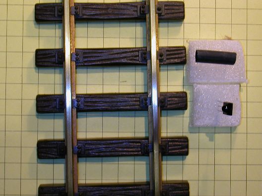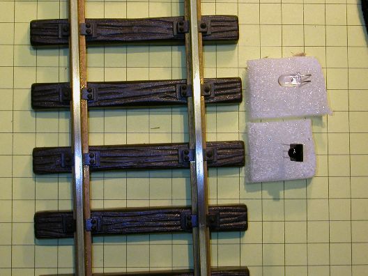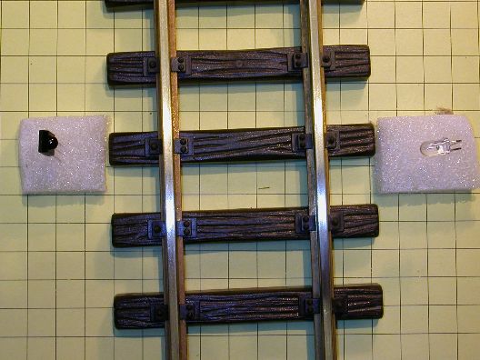 The emitter and receiver module can be placed on either side of a piece of track and connected to a device that you want to start when the beam of pulsed IR is interrupted. This is a great way to trigger trackside events whenever a train goes by. Note that the photo shows only the emitter (clear object on the right) and the receiver module (black object on the left) without any wiring or supporting circuitry. Also, for simplicity's sake, the emitter and detector are placed directly across from one another. A better placement may be to put them at a diagonal to the track so that the beam remains broken even when gaps between cars go by.