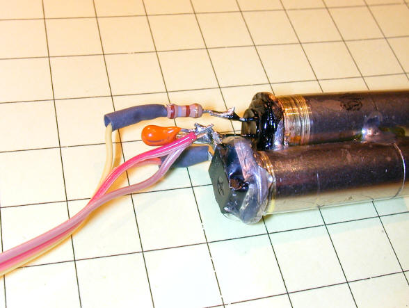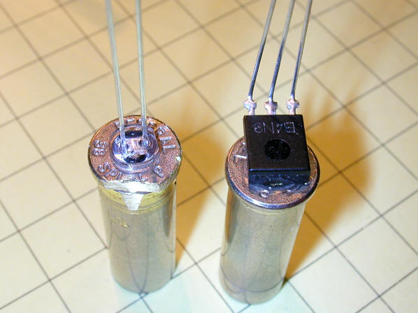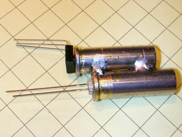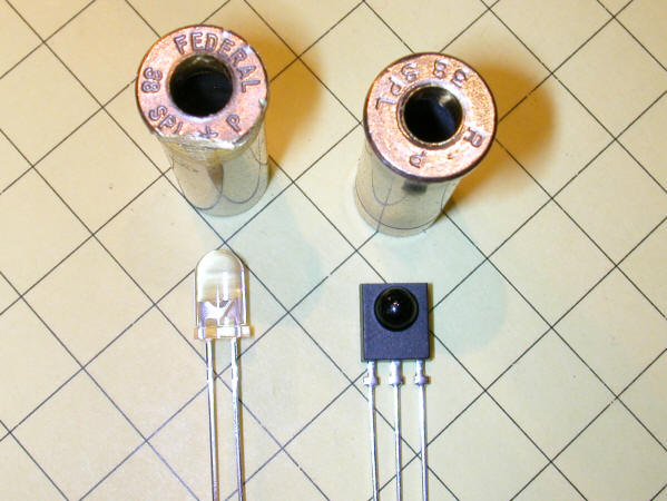 In this photo you can see the two shell casings. The one on the left has been drilled out to 13/64" for the LED and the one on the right to 3/16" for the lens on the IR detector. Note that the edge of the left casing has been ground flat so that the two cartridges can be soldered together, one a bit forward of the other.