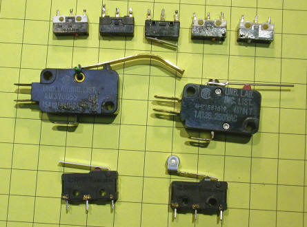 Micro switches are available from a number of sources including Radio Shack (275-016 & 275-017), Hosfelt (51-403) and All Electronics (SMS-209 that claims to be watertight!) You can also salvage very small micro switches from old computer mice. Each of the two or three mouse buttons activates a micro switch that is inside of the case. The smallest switches in the photo above were removed from mice.