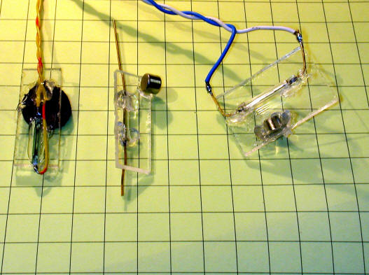 First glue the reed switch to a piece of Plexiglas or other non-metallic base material. I found that the reed switches that I used worked best if the reeds inside of the glass vial were held in a vertical position. Next attach an LED or other light and battery to the reed switch so that you can tell when its contacts are closed. Put the small magnet on the bottom of the Plexiglas and move it around until the reed switch’s contacts close and the light goes on. Now bring another magnet near the reed switch and see if the contacts open again. It will probably take a bit of experimentation, and at least 3 hands, but you should be able to find a position for the first magnet so that the reed switch reliably keeps its contacts closed but opens them when a second magnet is nearby. Once you find a location that works well glue the magnet in place. Below are three NC reed switches that I put together while testing. Each of them has a small reed switch on one side of the Plexiglas and a small magnet strategically placed and glued on the other side.